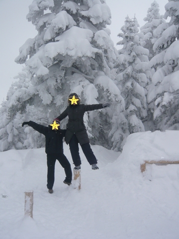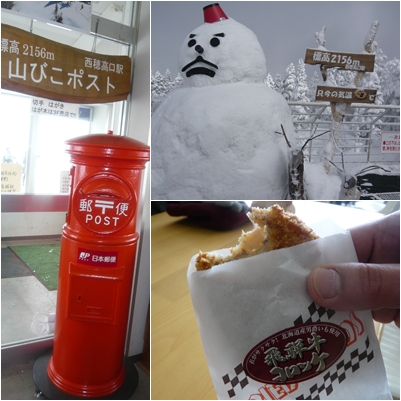 大部份人來新穗高都是為了乘搭雙層纜車, 山頂上的展望台被濃霧與白雪包圍著, 我一心一意的來探望位於2156米高的火紅郵筒(香港的變了色, 總是不順眼), 還買了名信片準備寄出我的祝福, 怎知位置被"樣衰衰"的雪人取代了, 好一會才發現它被安置在室內的不當眼處. 情緒有點低落, 療傷去......即叫即製, 新鮮出爐的飛驒牛薯仔餅, 出奇的好味, 才200日元的醫藥費, 便宜呀!(懷念中......)