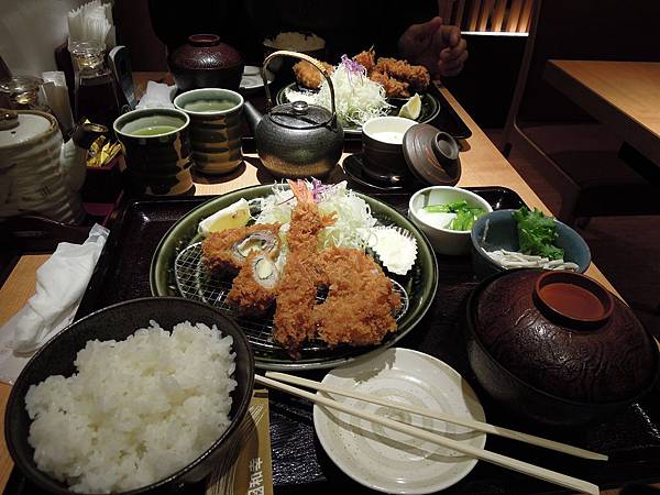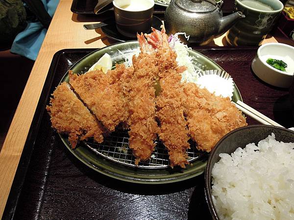 好味道啊! 揶菜, 白飯, 味噌湯任添, 這是あじさい(1,500yen), 有兩隻蝦, 非常彈牙, 一件豬扒, 用外脆內軟來形容應該最好不過, 一件蟹cream餅可樂餅, 這個嘛......算吧, 炸得很出色, 卻不懂欣賞, 還有滑溜蒸蛋.