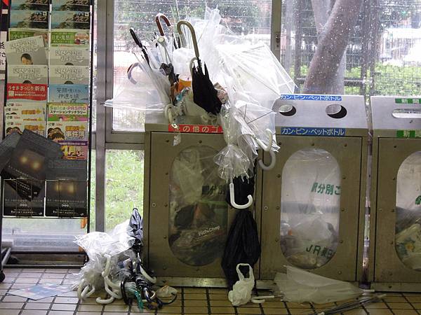 飯後決定先回旅館休息一回, 車站的風很大, 列車也因大風延遲, 回到関內駅, 垃圾筒全部都是爛傘子, 可以想像風有多強.