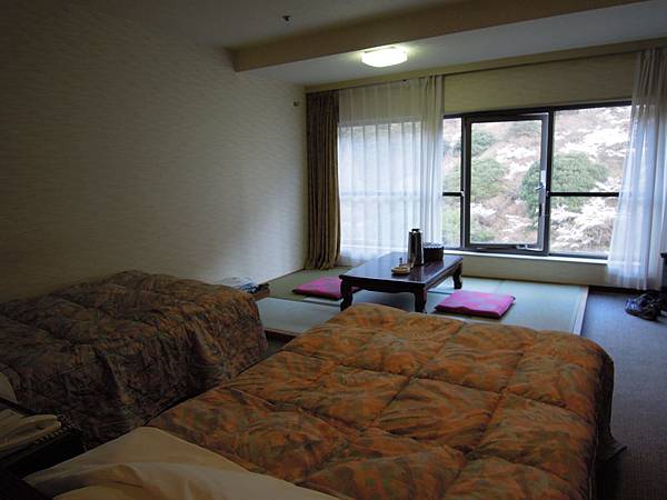 已經有心理準備酒店房間舊, 所以都沒有怨言, 亦算是整潔. 這裡的溫泉雖佔地廣, 但除了室內的浴池比較大之外, 園林中的都是只可容1-2人的池子, 露天風呂則只有一個, 也最多只能容下四個人. 由洗澡的地方要下樓梯才可到逹園林, 對小朋友和老人家來說, 我覺得很危險. 由園林入口光著身子慢慢的走到露天風呂大約要一分鐘, 冷天時真的要在內風呂好好暖身子才好走過去. 第一次浸的時候我只在園林小池浸了一會便一直待在露天風呂, 直到人擠得很才起身, 最初一人獨佔, 其實很舒服呢. 晚上和早上都沒有走進園林了, 怕冷病, 只在內風呂泡, 我覺得泉質很一般.