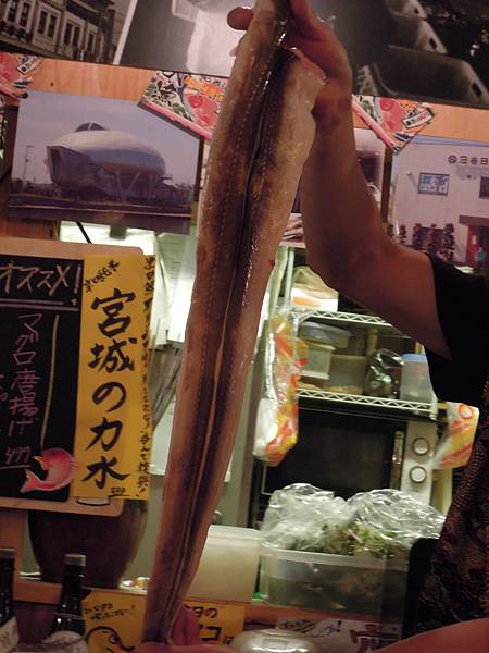 我們也來玩啊, 以3,000日元投了一條活生生的穴子. 店員把洗乾淨了的穴子給我們拍照.