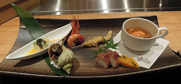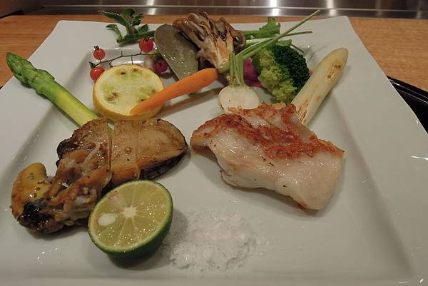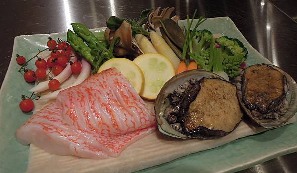 鐵鉄燒的主菜上場, 先是魚料理, 大廚先把活鮑給我們過目, 再問我們想選剌身還是燒的吃法, 我們選了後者.