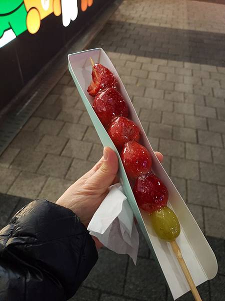 士多啤利多汁帶點酸, 加上甜度適中的冰塘, 個人覺得很好味, 我吃得很滿足啊! 攤檔就在酒店對面的十字路口, 在房間可以看到他晚上10時收舖. 哈哈! 忘記了是2000W還是3000W. 隔天晚上我又買了兩串吃!